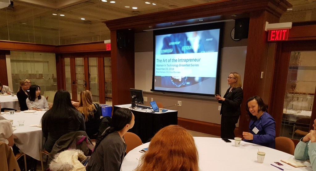 Attendees arrived bright and early to VanWIT’s November Breakfast Speaker Series, excited to hear from Shari Wallace, the CIO from the City of Burnaby and to network with their peers. The Beedie School of Business at SFU provided a beautiful venue to host supporters of women in tech as they learned how to become an intrapreneur to navigate a career path and achieve success within an organization. Shari took questions from the audience and created an interactive atmosphere for a full house of women and men with good use of humour and sage advice.